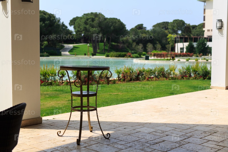 Территория отеля с бассейном и деревьями, лето, день