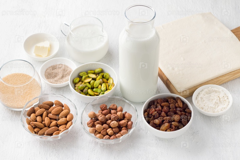 Ингредиенты для традиционного арабского десерта Умм Али: орехи, изюм, молоко, сливки, коричневый сахар, ванильный сахар, мука, масло и готовое слоеное тесто на светло-сером фоне