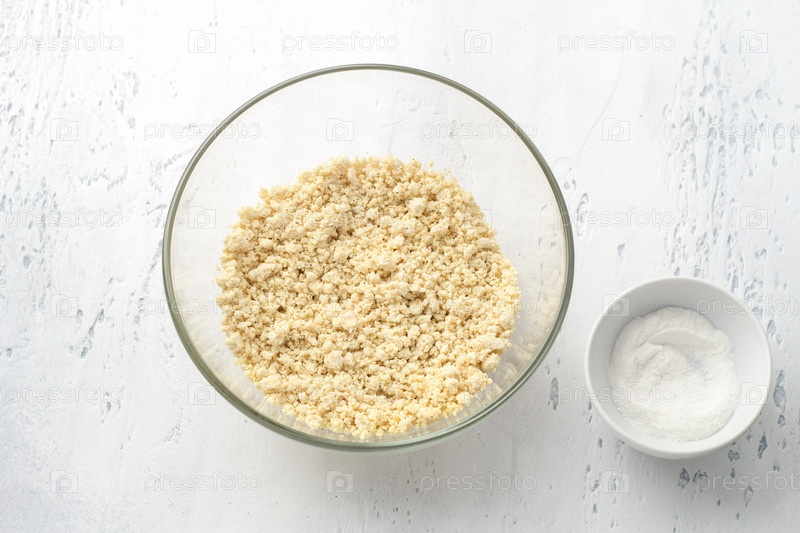 Стеклянная миска с сырым тестом для веганских сырников из тофу и миска с рисовой мукой на светло-голубом фоне, вид сверху. Готовим полезные веганские сырники или другие блюда