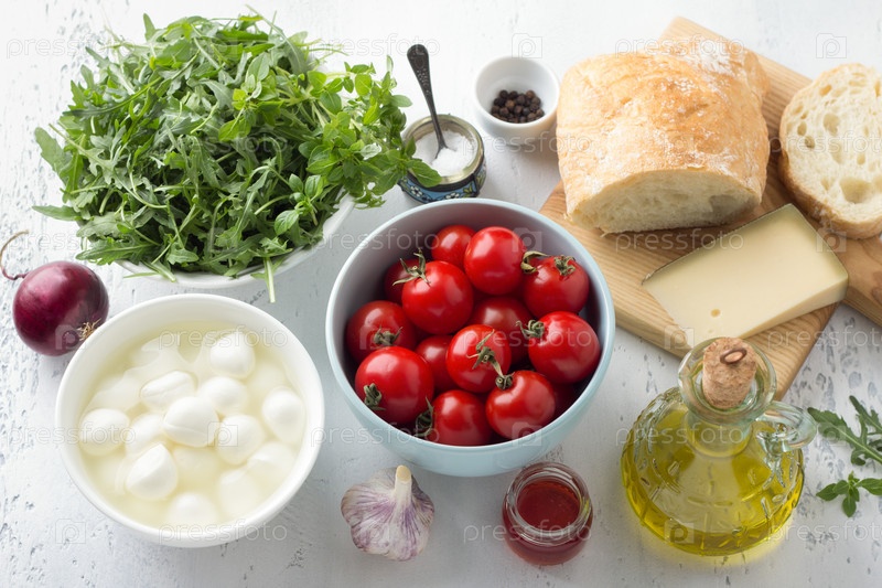 Ингредиенты для итальянского салата панцанелла: черри, руккола, базилик, моцарелла, хлеб чиабатта, сыр пармезан, оливковое масло, красный лук, чеснок, винный уксус, соль, перец на светло-голубом фоне