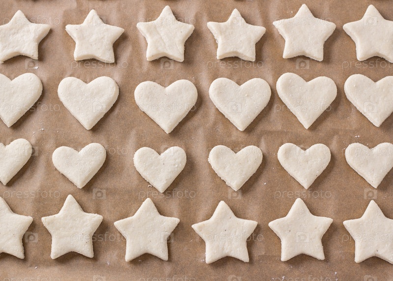 Сырое печенье в виде звезд и сердец на противне с пергаментом, вид сверху. Этап приготовления вкусной домашней выпечки
