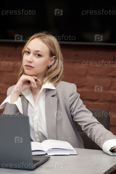 Молодая бизнес-леди сидит за столом в офисе с ноутбуком