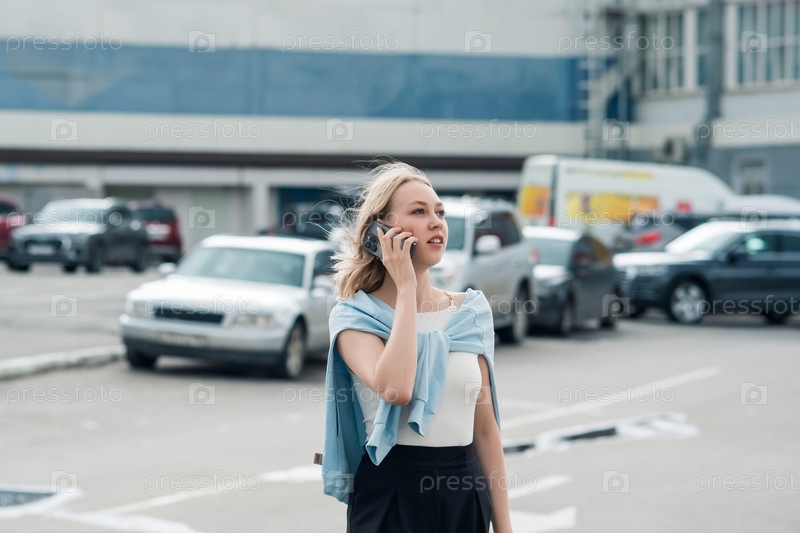 Молодая красивая блондинка обернулась во время разговора по телефону в городе