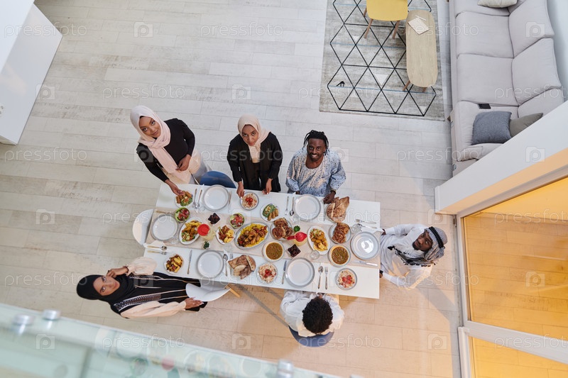 Вид сверху на мусульманскую семью, которая радостно собирается за столом, с нетерпением ожидая общего ифтара, занимаясь приготовлением общей трапезы и объединяясь в предвкушении коллективной молитвы, олицетворяя дух единения, преданности и культурного пра