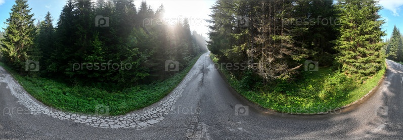 Сосновый лес с извилистой проселочной дорогой свежим летним утром с дымкой и туманом