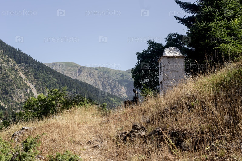 Панорамный вид на горы, скамейку, еловый лес и деревню