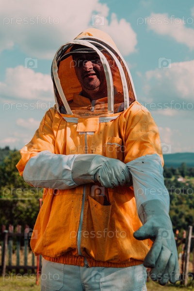 Пчеловод надевает защитный костюм и готовится войти на пасеку