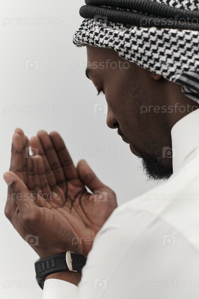 Афроамериканский мусульманин поднимает руки в молитве, ища утешения и преданности Богу, стоя в одиночестве на безмятежном белом фоне, символизируя глубокое выражение веры и созерцания