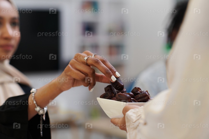 Молодая мусульманка, одетая в хиджаб, осторожно берет финики, символизируя завершение поста в священный месяц Рамадан, воплощая собой сцену духовного размышления, культурных традиций и ожидания общественного ифтара