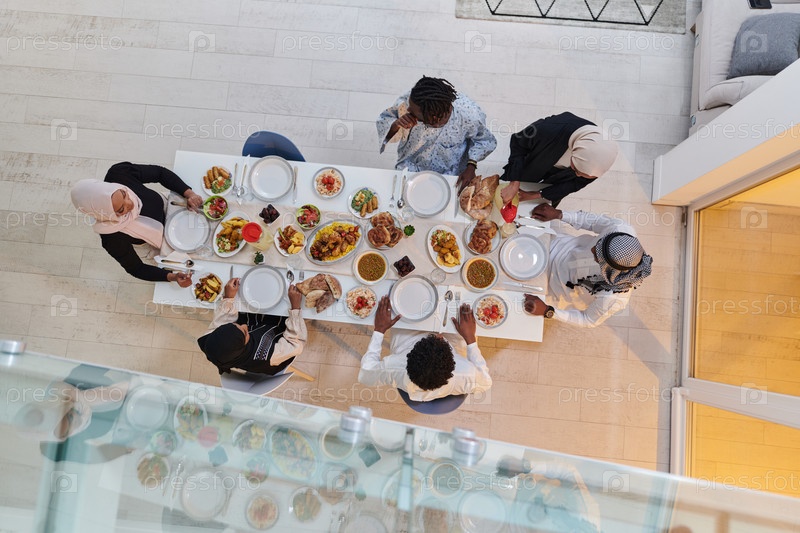 Вид сверху на мусульманскую семью, которая радостно собирается за столом, с нетерпением ожидая общего ифтара, занимаясь приготовлением общей трапезы и объединяясь в предвкушении коллективной молитвы, олицетворяя дух единения, преданности и культурного пра