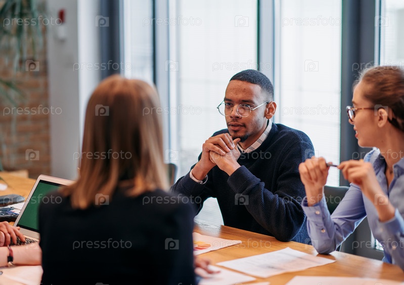 В яркой атмосфере современного офиса стартапа разнообразная команда профессионалов в сфере бизнеса участвует в обсуждениях различных проектов и разрабатывает новые бизнес-стратегии, олицетворяя креативность и инновации в предпринимательской среде