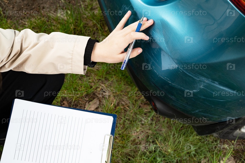 Крупный план поврежденного бампера автомобиля с человеком, заполняющим форму на планшете, получающим страховку