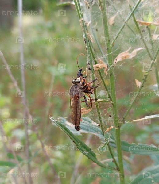Ктырь.Муха-разбойник поймала жука-усача.Макросъемка