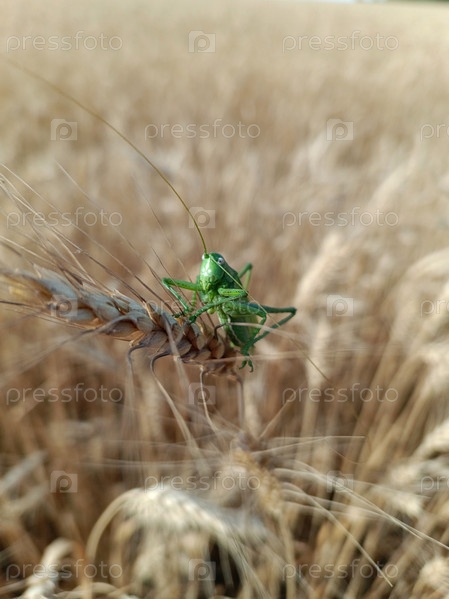 Кузнечик зеленый с большими усами впечатляюще сидит на колосе пшеницы и смотрит в глаза