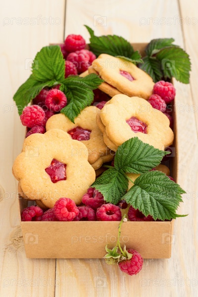 Домашнее печенье с малиновым джемом и свежей малиной в крафтовой коробке на деревянном фоне
