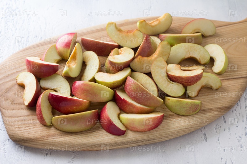 Деревянная доска с нарезанными яблоками для выпечки или других блюд на светло-голубом фоне