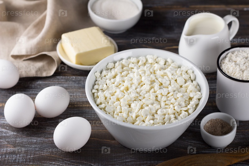 Миска с творогом, яйцами, мукой, маслом, молоком, сахаром, ванильным сахаром на деревянном фоне. Ингредиенты для домашней выпечки