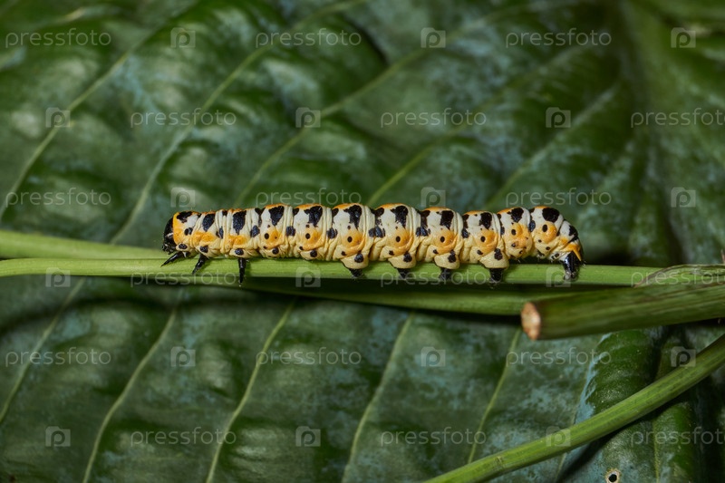 Гусеница бабочки-красавицы (лат. Cucullia lactucae) питается бутонами цветов чертополоха