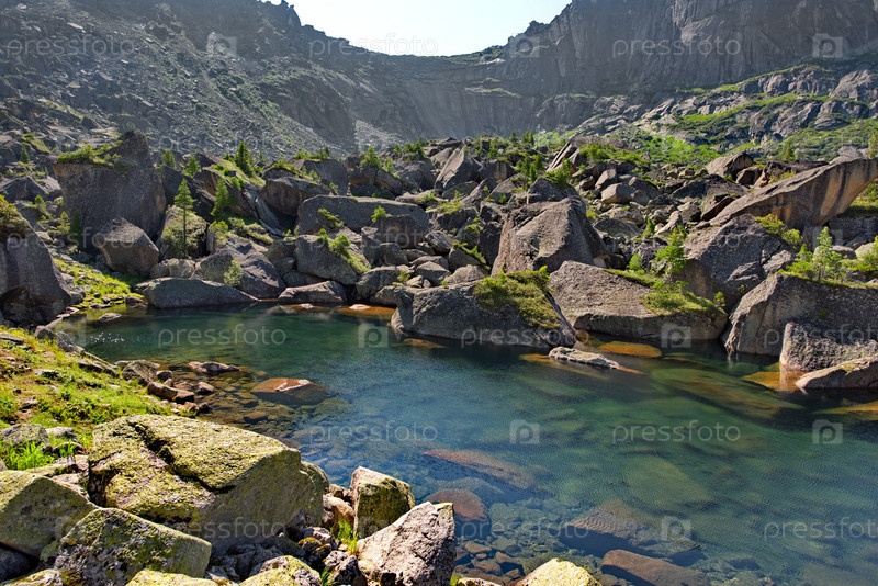 Россия. Юг Сибири. Западный Саян. Панорамный вид на высокогорное озеро Гармония, окруженные суровыми скалами природного горного парка Ергаки