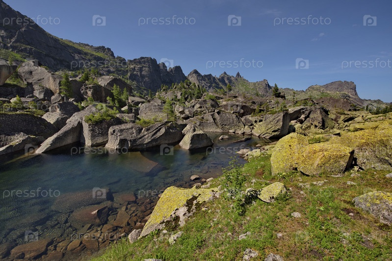Россия. Юг Сибири. Западный Саян. Панорамный вид на высокогорное озеро Гармония, окруженные суровыми скалами природного горного парка Ергаки