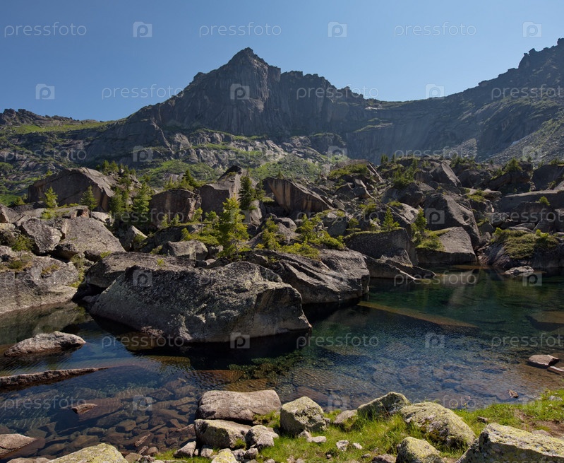 Россия. Юг Сибири. Западный Саян. Панорамный вид на высокогорное озеро Гармония, окруженные суровыми скалами природного горного парка Ергаки