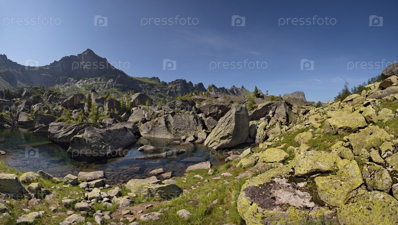 Россия. Юг Сибири. Западный Саян. Панорамный вид на высокогорное озеро Гармония, окруженные суровыми скалами природного горного парка Ергаки
