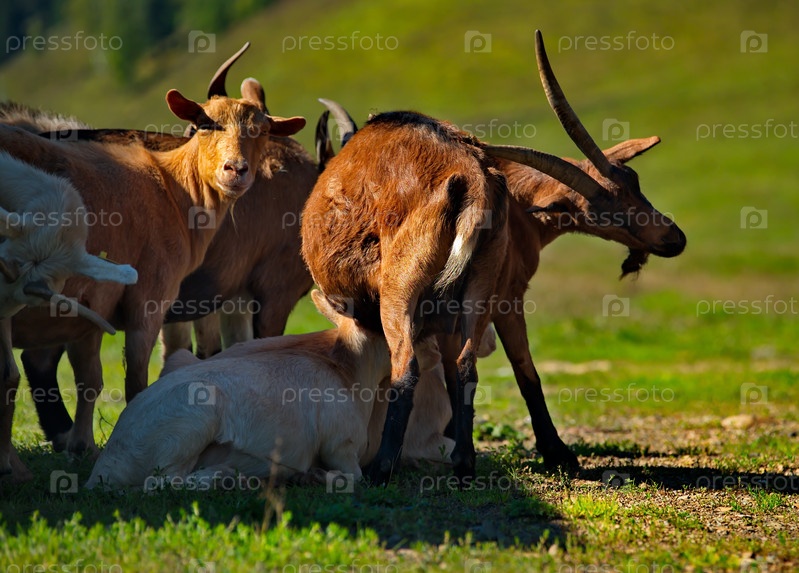 Россия. Горный Алтай. Стадо длиннорогих кос отдыхает в лучах заходящего солнца