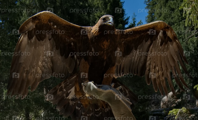 Кыргызстан. Портрет беркута, сидящего на специальной перчатке в руке хозяина в горах вокруг озера Иссык-Куль