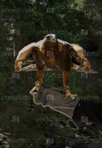 Кыргызстан. Портрет беркута, сидящего на специальной перчатке в руке хозяина в горах вокруг озера Иссык-Куль
