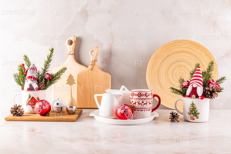 Новогодний рождественский кухонный фон столешницы с экологически чистыми кухонными принадлежностями и новогодним орнаментом столовых приборов. Вид спереди