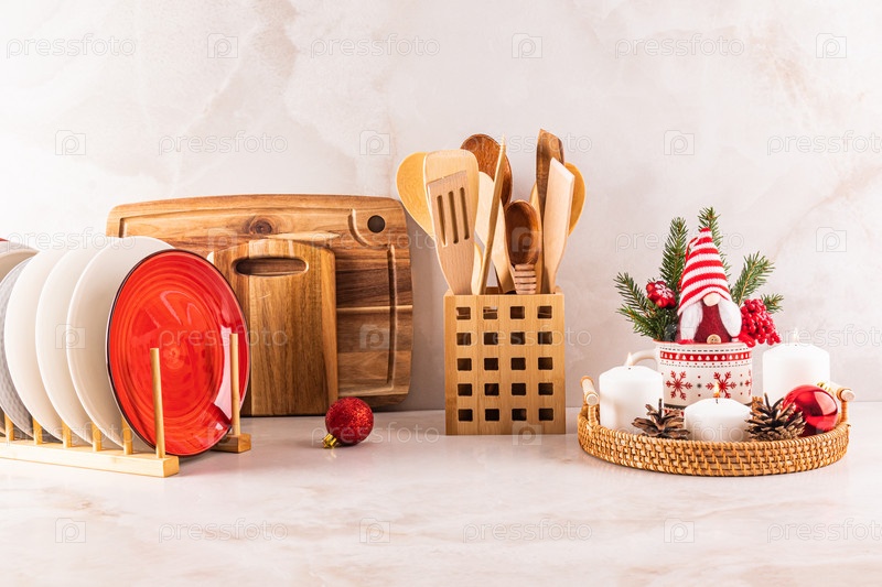 Кухонная мраморная столешница, оформленная в минималистичном стиле к Новому году и Рождеству. сушилка с тарелками, набор свечей, новогодний гном