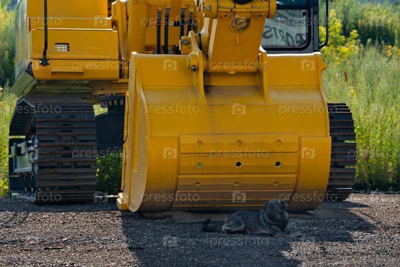 Новокузнецк, Россия. Июль 31, 2024. Бездомная собака неизвестной породы отдыхает в тени огромного ковша экскаватора