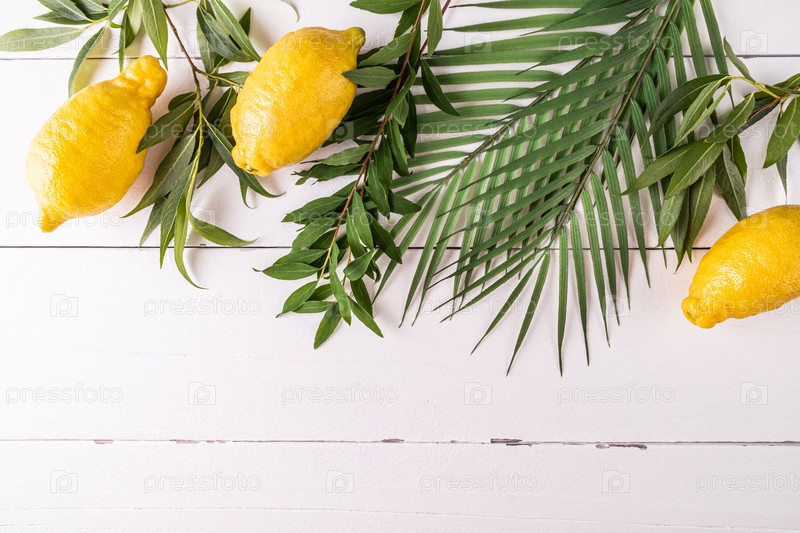 Еврейский праздник урожая. Традиционные символы праздника на белом деревянном фоне. пальмовые листья, ветвь ивы, цитрусовый этрог. Копировальное пространство