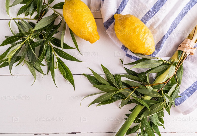 Красивый праздничный фон еврейского праздника Суккот. Традиционные символы праздника на белом деревянном фоне. вид сверху