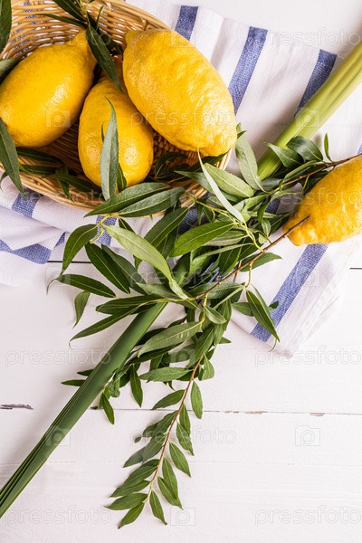 Вертикальный праздничный фон еврейского праздника Суккот с традиционными символами праздника радости и урожая. этрог, ива, пальмовые ветви