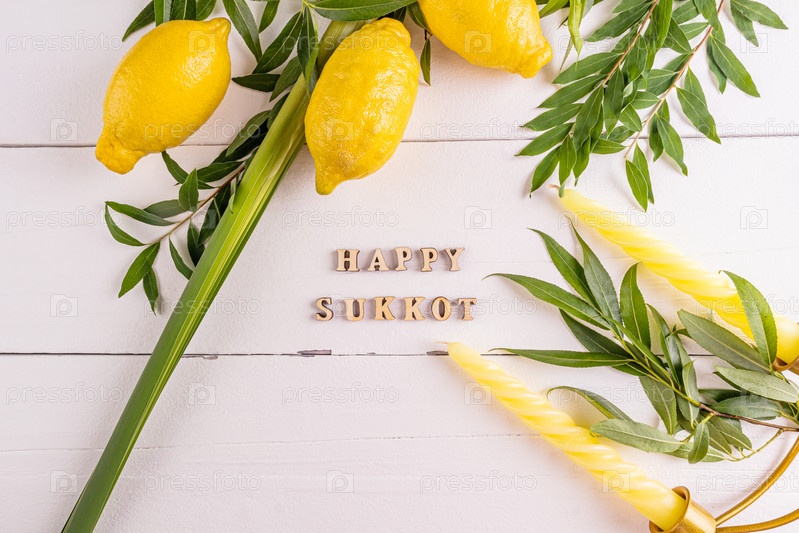 Красивый праздничный фон для еврейского праздника урожая Суккот с традиционными символами и свечами. Белый деревянный фон