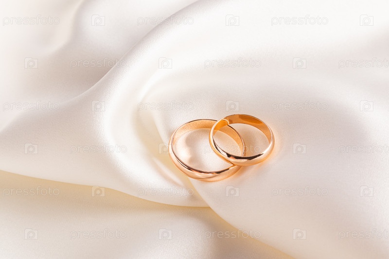 Два золотых элегантных обручальных кольца лежат на мягких складках бежевой атласной ткани. стильный свадебный фон. открытка. приглашение. Презентация продукта