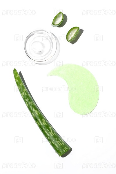 Гидрогелевые патчи от темных кругов под глазами с алоэ вера на белом фоне с листьями алоэ. Лабораторные исследования