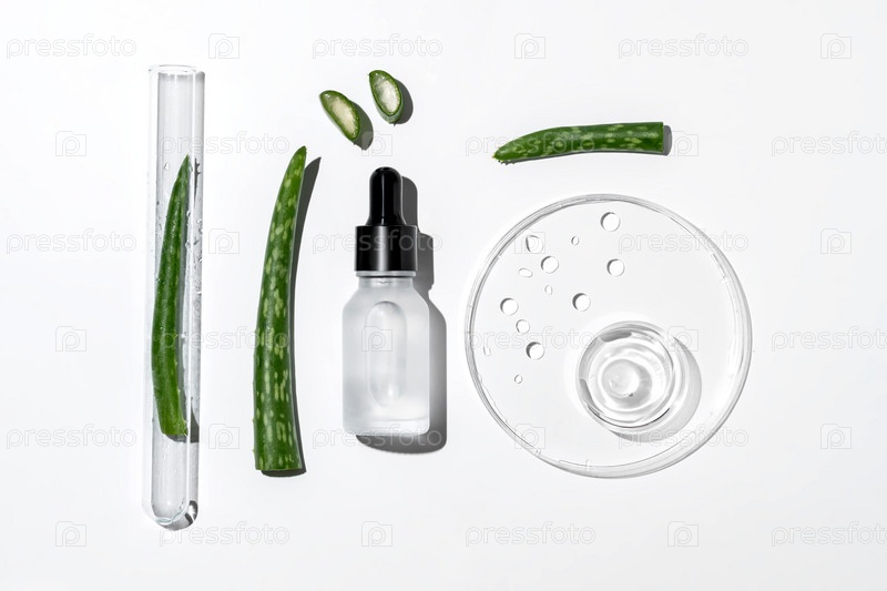 Абстрактная косметическая лаборатория. Кусочки алоэ вера и свежий гель в стеклянной чашке Петри, флакон-капельница с экстрактом алоэ на белом фоне
