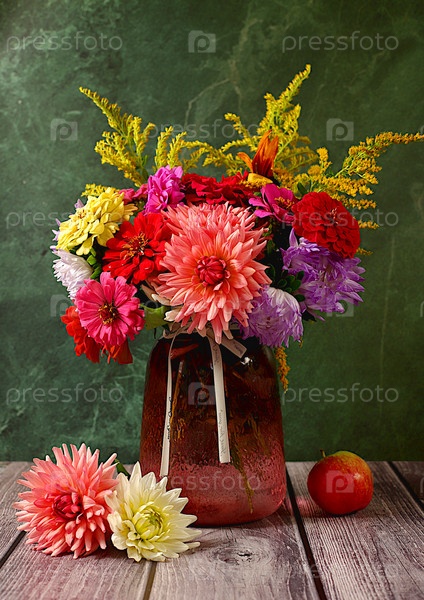 Красивый натюрморт с букетом георгинов, астр, бархатцев на старом мраморном столе, осенний баннер, абстрактная цветочная композиция, деревенский стиль, праздничная открытка