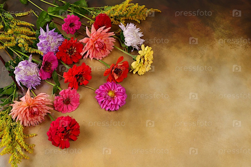 Цветы георгины, звезды, люстры на старом бетонном фоне, осенний баннер для рекламной продукции, абстрактная цветовая композиция flat lay. стиль кантри, праздничная открытка,