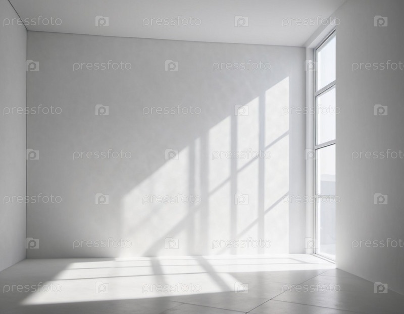 Белая стена и большое окно. Солнечный свет льется через окно, отбрасывая длинные тени на стену. Комната светлая и просторная, с чистым, минималистским ощущением. Фон для интерьера или демонстрации продукта