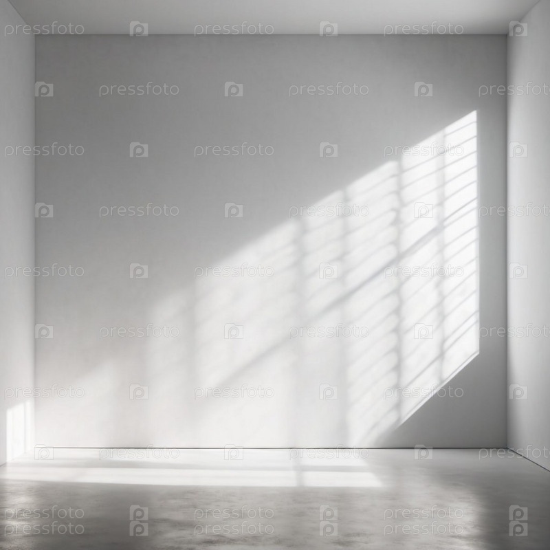 Белая стена и большое окно. Солнечный свет льется через окно, отбрасывая длинные тени на стену. Комната светлая и просторная, с чистым, минималистским ощущением. Фон для интерьера или демонстрации продукта