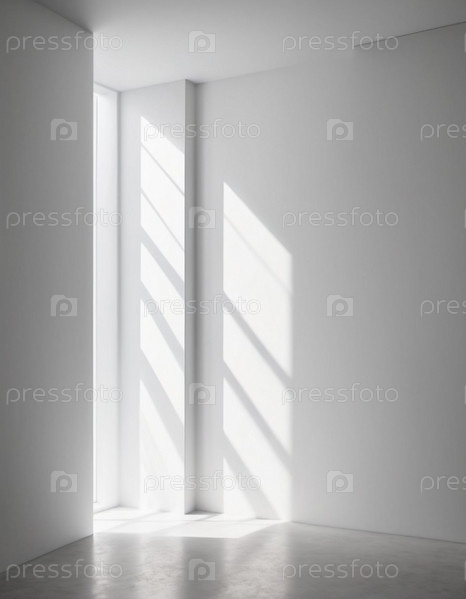 Белая стена и большое окно. Солнечный свет льется через окно, отбрасывая длинные тени на стену. Комната светлая и просторная, с чистым, минималистским ощущением. Фон для интерьера или демонстрации продукта