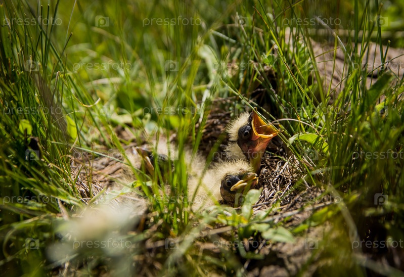 Птенцы в гнезде на земле среди травы ждут свою мать