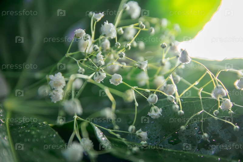 Цветочная композиция из гипсофильных лампочек и листьев аралии