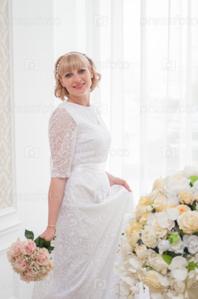НЕВЕСТА в белом платье и с букетом цветов