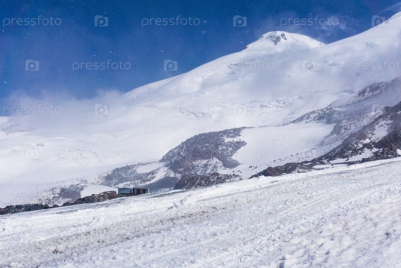 Вид на снежный склон и вершину горы Эльбрус сквозь снег и облака. Эльбрус — самая высокая вершина Европы