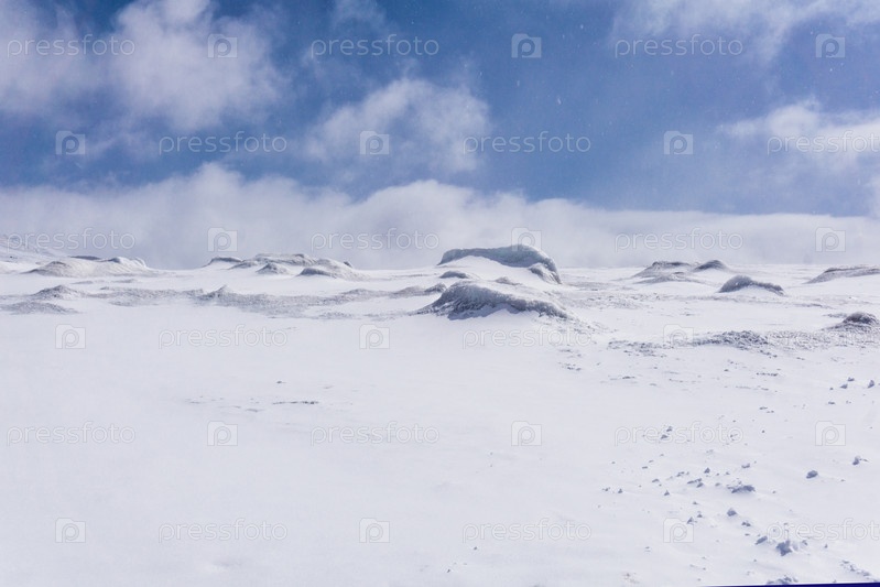 Снежная пустыня с торосами, безжизненный снежный пейзаж с метелью
