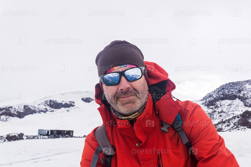 Портрет альпиниста на заснеженном склоне Эльбруса на пути к вершине. Эльбрус — высочайшая вершина Европы